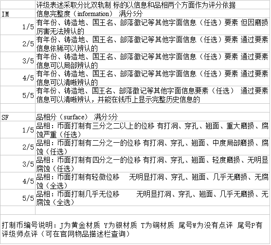打制幣評(píng)級(jí)標(biāo)準(zhǔn)