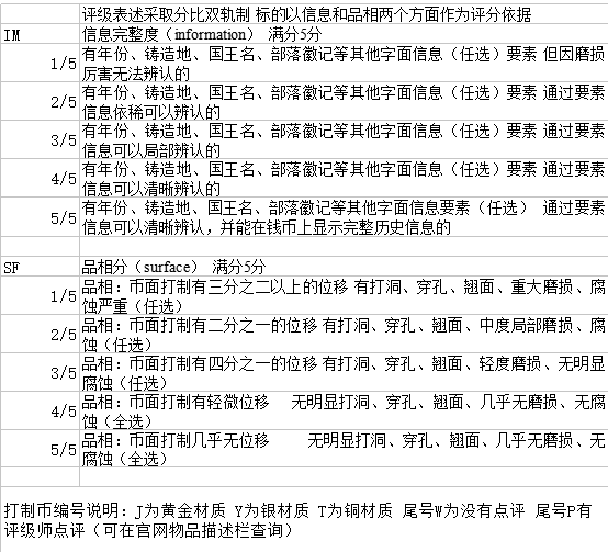 華龍(CNCS)打制幣評級,采取目前國際通用的“經典五分制”的分比雙軌制作為評級框架。 并在此基礎上整合細化標識參照物,創新地將幣本身的客觀狀態和幣面信息融合到打制幣的評級體系中來。用更客觀準確的評級方法完整還原錢幣的經濟價值以及歷史價值。